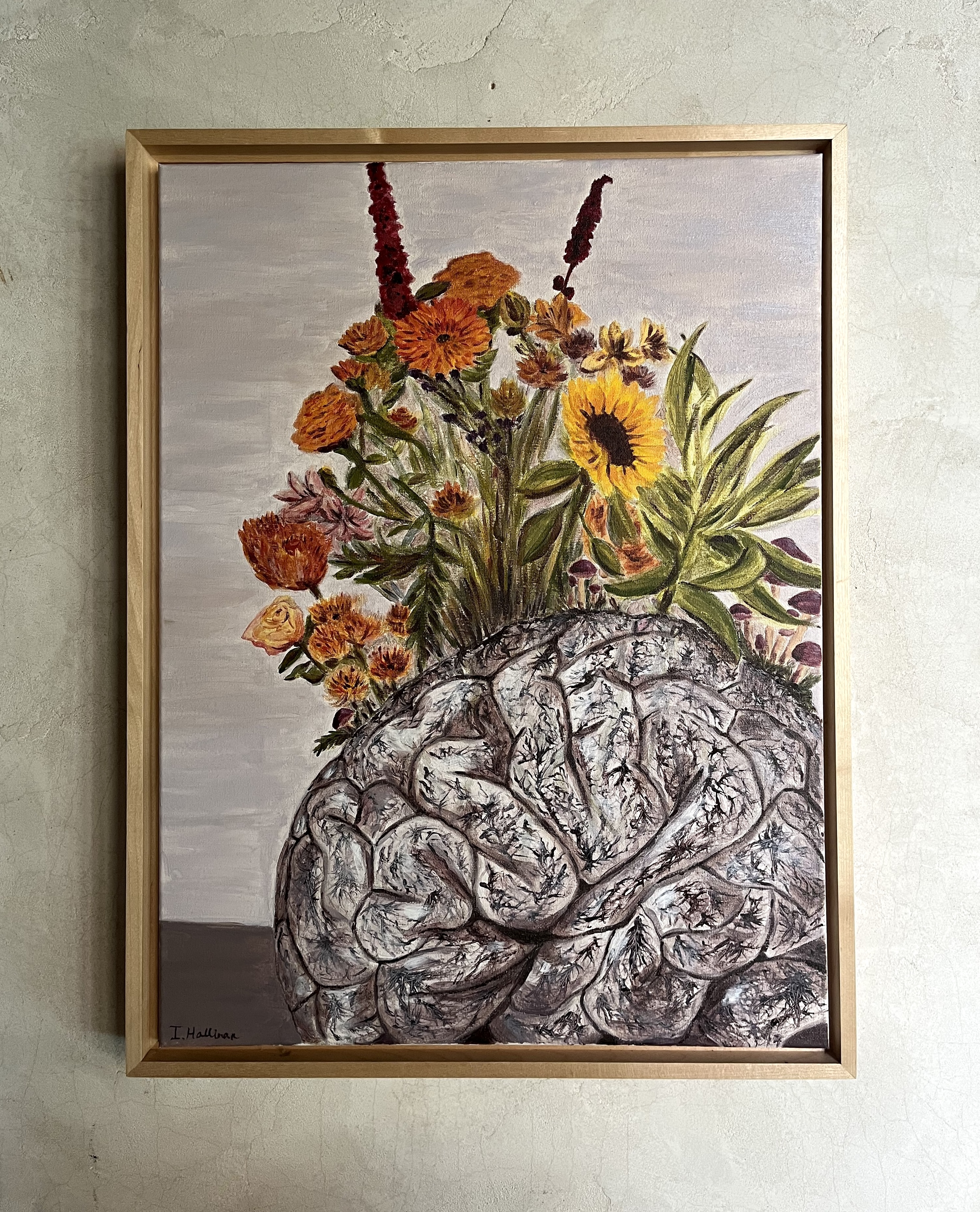 This artwork depicts an impressionistic human brain and a bouqet of flowers and mushrooms. The work draws on the parallel between neurons of the human brain, roots of plants, and mycelium of fungi. Colorful flowers and mushrooms spring forth from the glass brain vase, symbolizing the creativity, complexity, fragility, and beauty of consciousness.