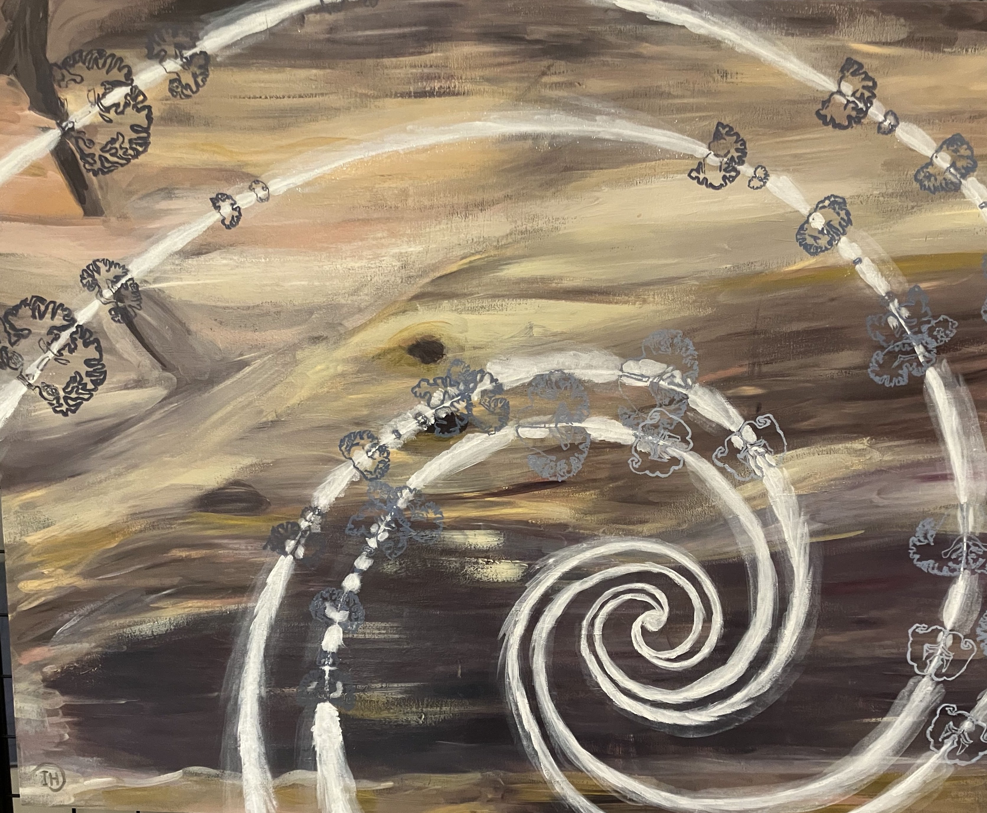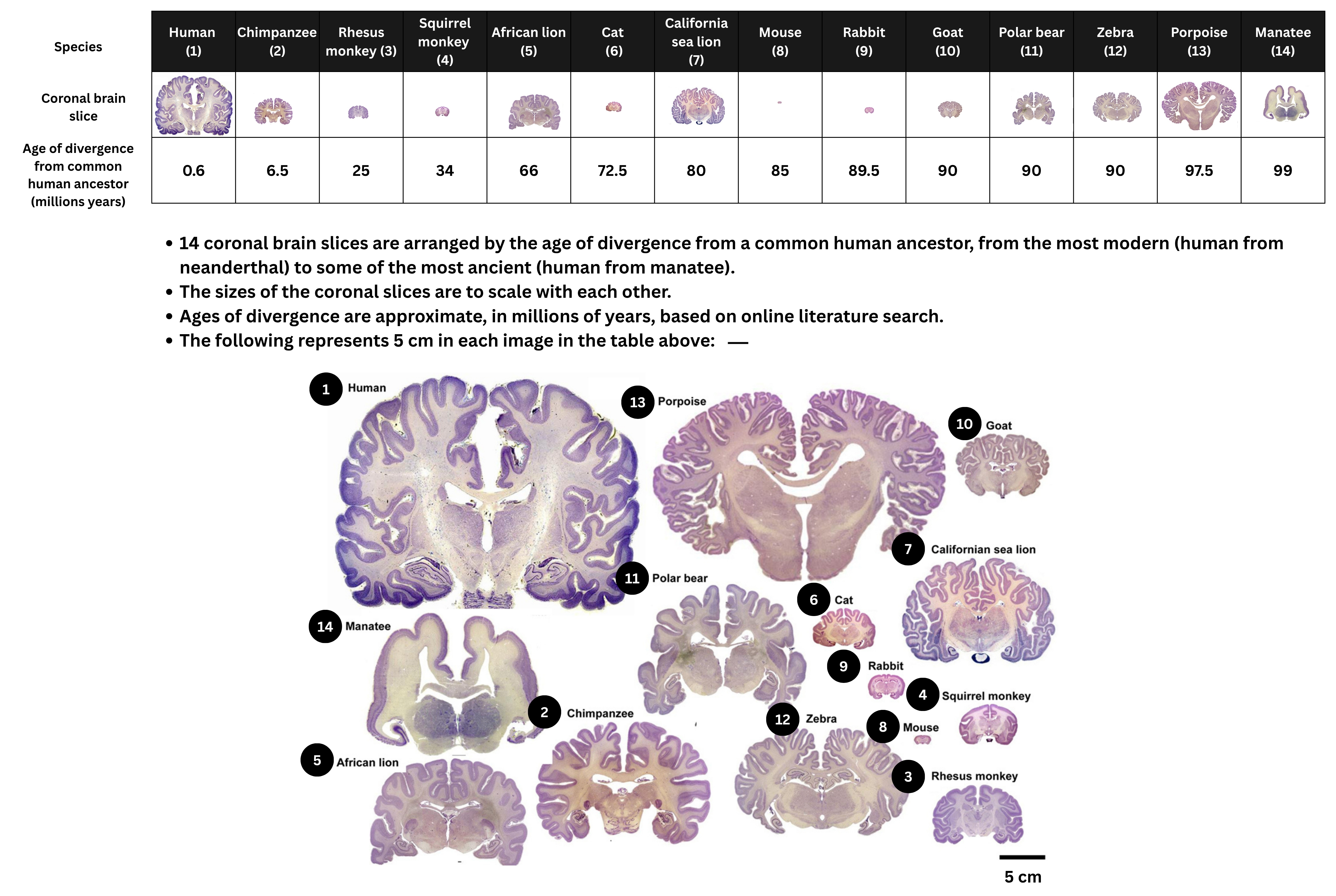 "Phylogenetic Echoes" is a meditation on growth, divergence, and shared ancestry across Earth's species. Across a wooden canvas, 14 coronal slices from a diverse mammalian phylogeny—including specimens from the mouse, porpoise, polar bear, and modern human—are meticulously arranged. They are sequenced by their chronological divergence from the human common ancestor. Their relative size is preserved. This evolutionary timeline is overlaid by Fibonacci spirals, structures found from the swirling arms of the Milky Way to patterns in terrestrial nature. The artwork suggests that the development of the brain's structure follows a non-linear growth pattern that echoes the fractal geometry shaping both terrestrial life and cosmic form.